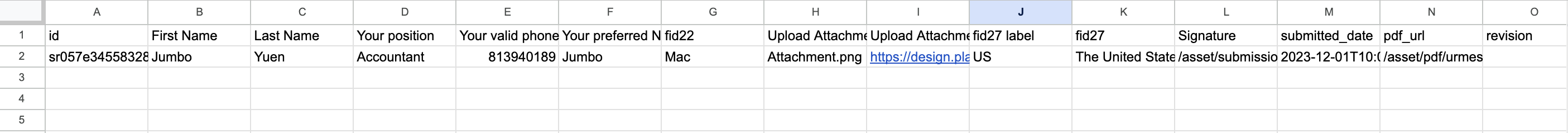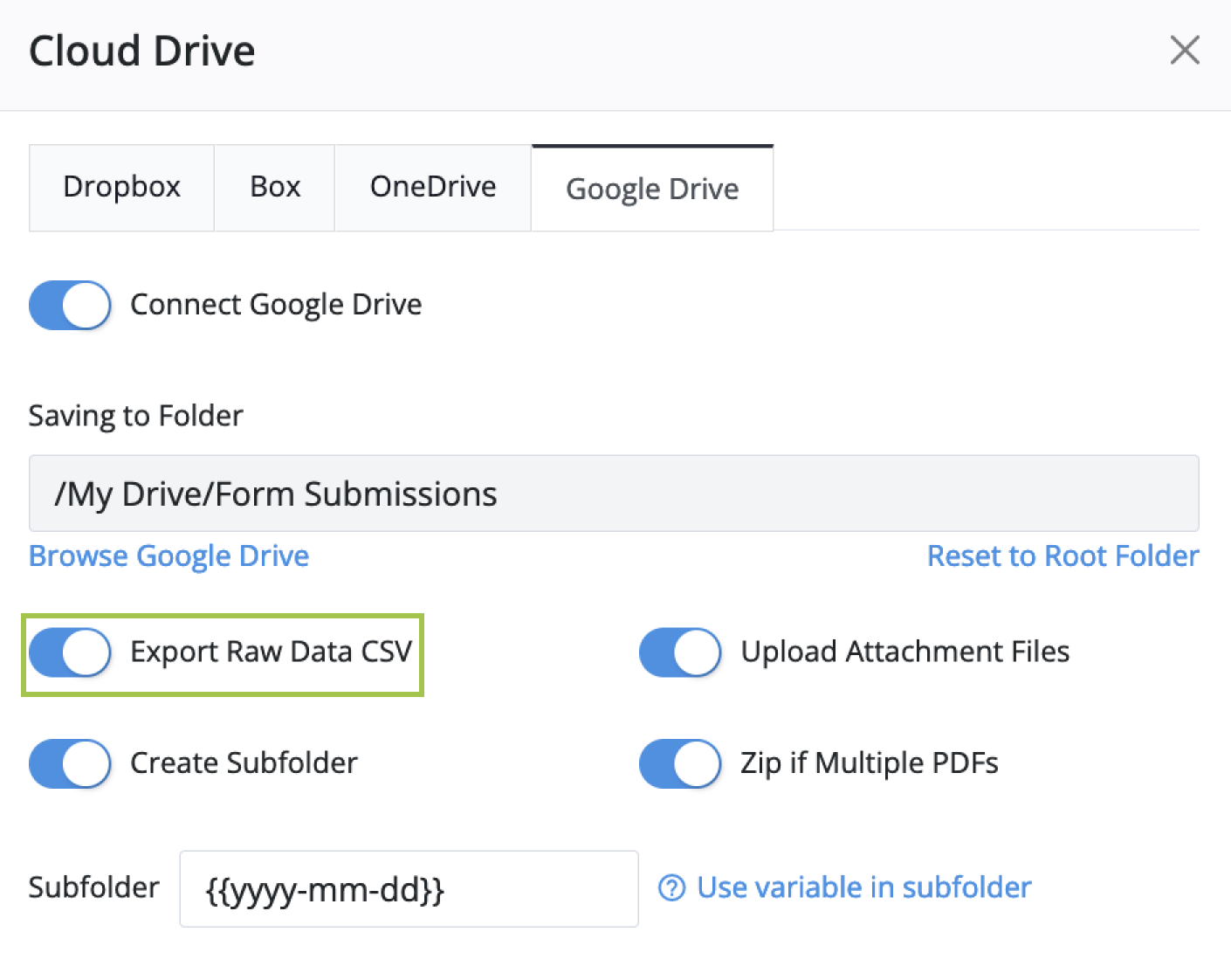 If you’ve integrated your form with a cloud drive and enabled “Export Raw Data CSV”, the CSV file will be automatically uploaded to your cloud drive. Refer to the documentation for more details.