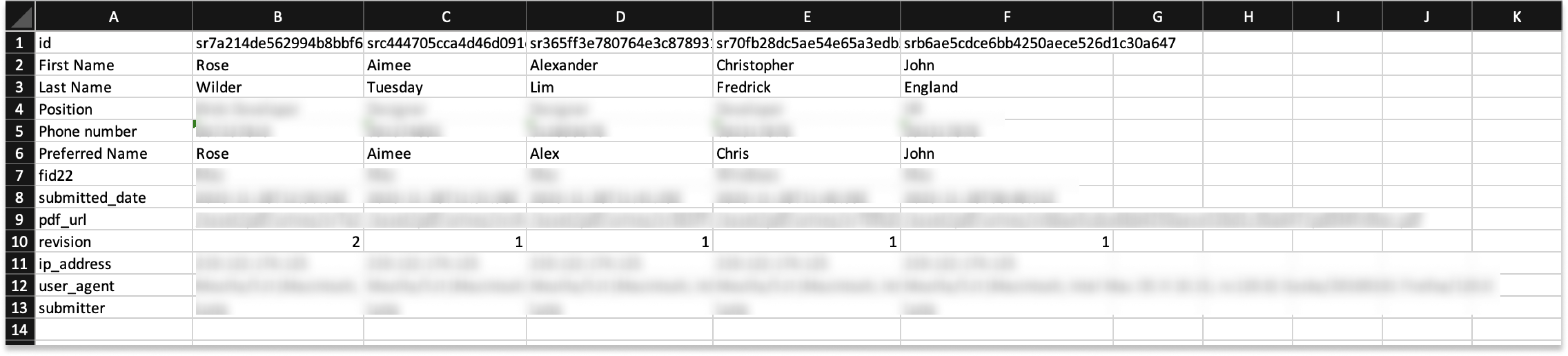 Choose a time range to export all submissions for a specific form in CSV format. Refer to our documentation for detailed instructions, or wacth our video tutorial.
