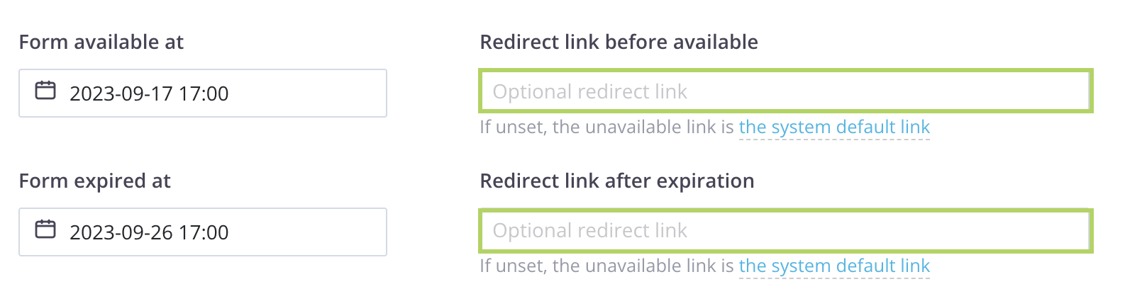 (Optional) Set two redirect links: one for when the form is not yet available to fill, and another for when the form has expired.