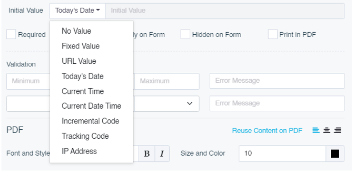 Of course! By utilizing the initial value feature, you can add a field to your form and set it to show today’s date automatically. This means that when respondents open the form, the field already have the current date filled in, making the registration process easier. PlatoForms also offers the following initial value options: