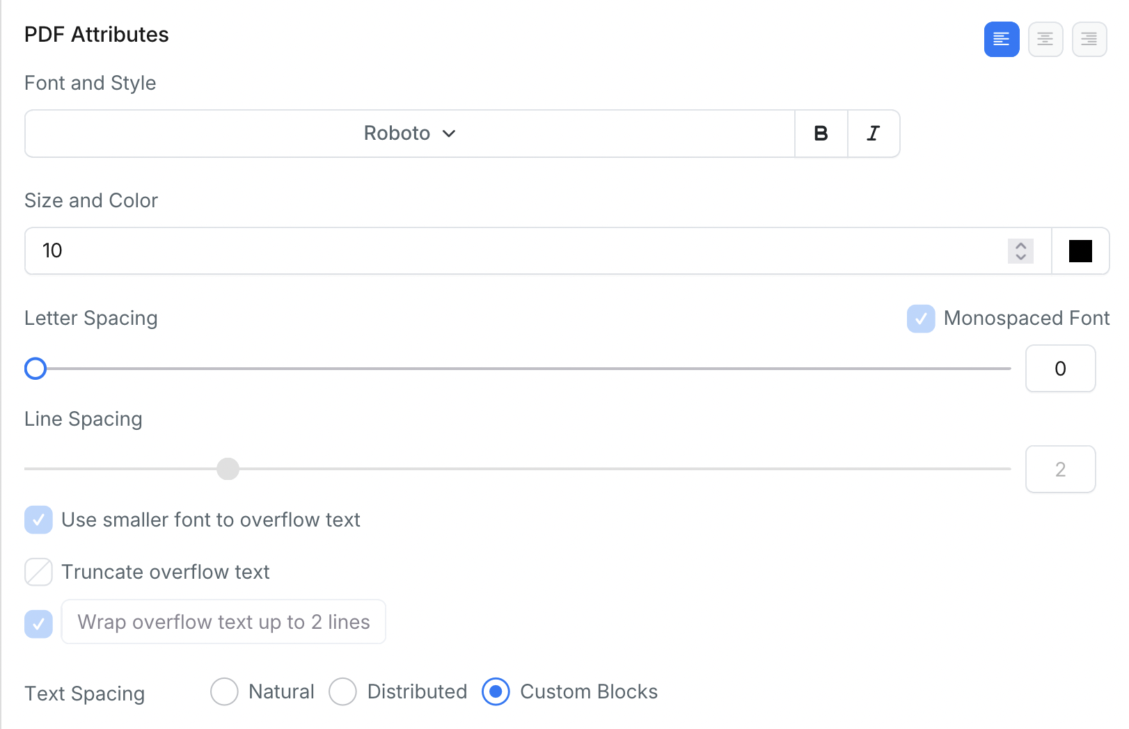 💡 Pro tip: In your PDF Attributes panel, select one of the monospaced fonts above when using Distributed or Custom Blocks spacing modes.