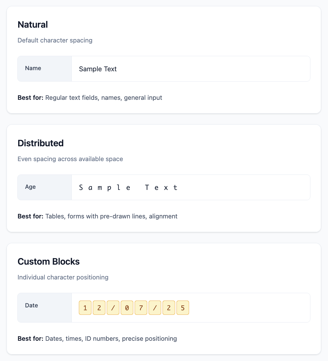 Text spacing options help you control how characters appear in your PDF forms. These new modes make your forms look cleaner and more professional by giving you precise control over text alignment.