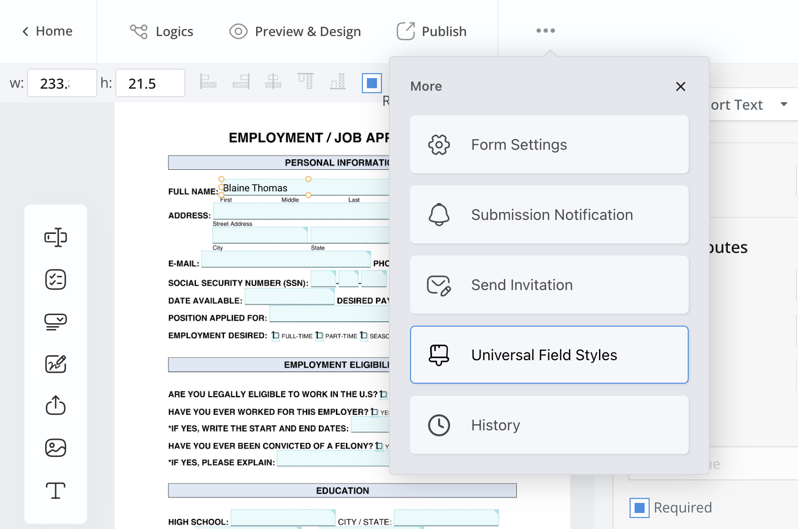 In the Form Builder, click the ••• icon, and select Universal Field Styles to set universal field font styles that apply to the entire form.