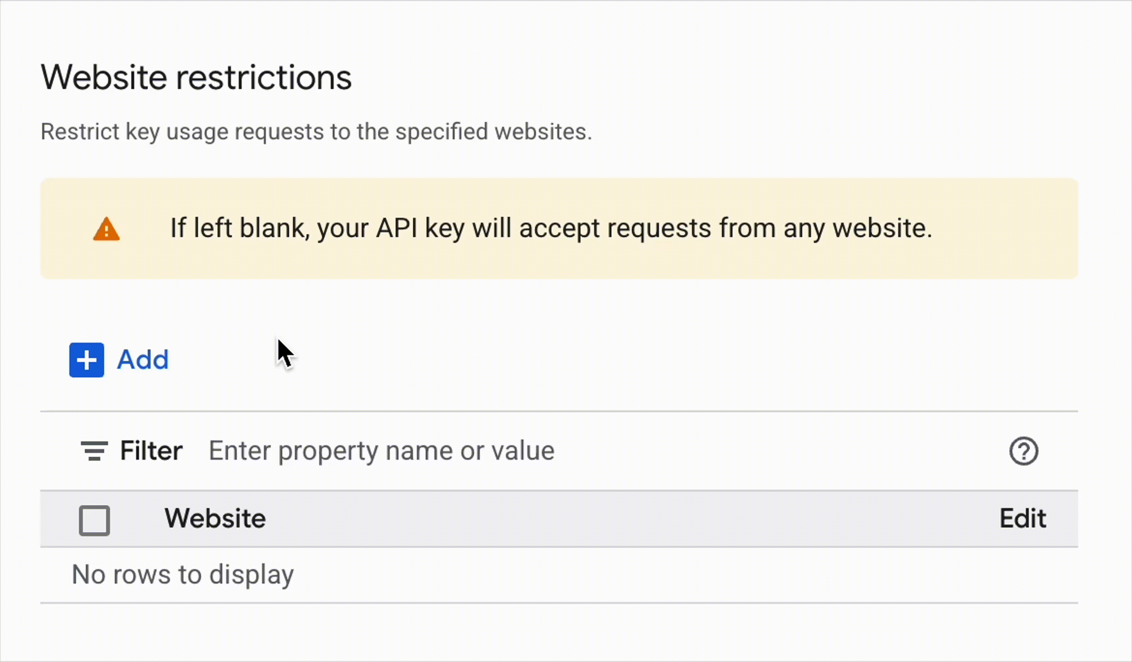 - Sous Restrictions de site web, cliquez sur + Ajouter, et entrez votre domaine en utilisant le protocole HTTPS complet et un joker (par exemple,