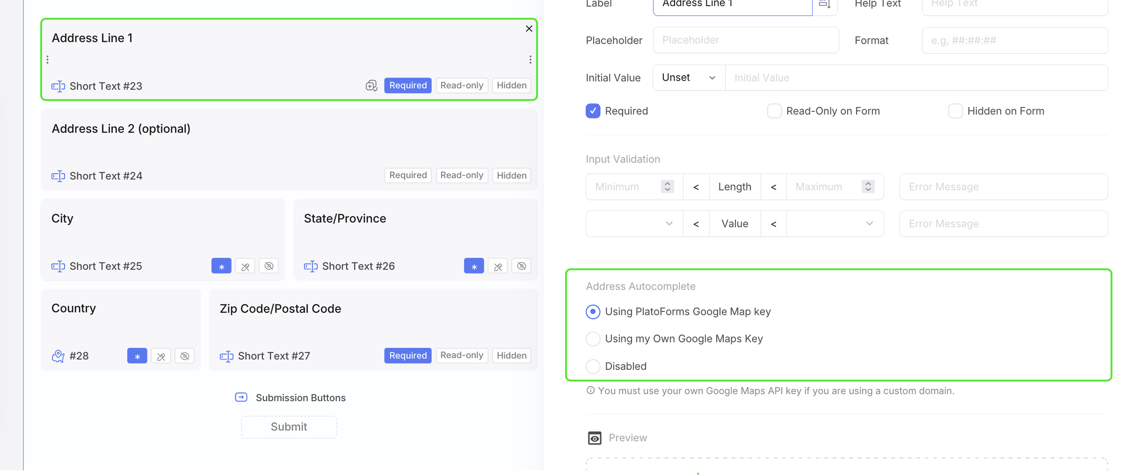 Ouvrez le créateur de formulaires PlatoForms et sélectionnez votre champ Adresse Ligne 1.