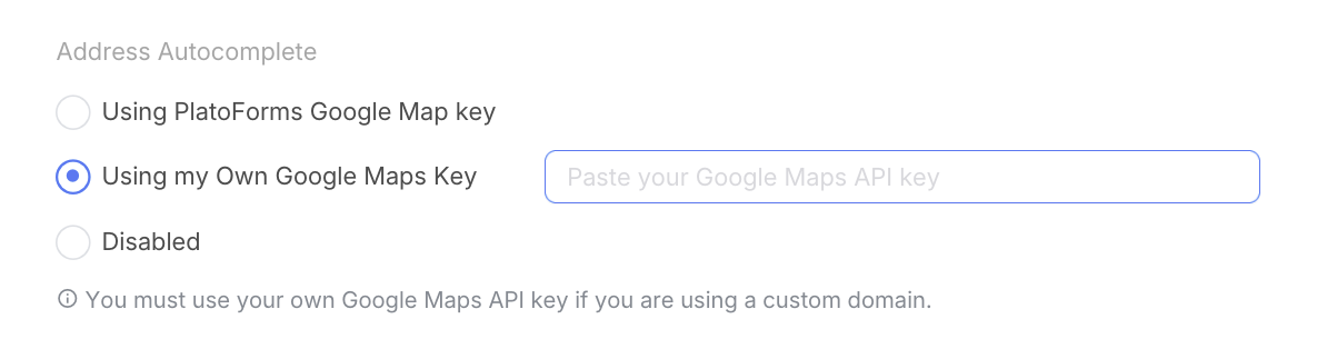 Si votre formulaire utilise un domaine personnalisé, vous devez utiliser votre propre clé API Google Maps.