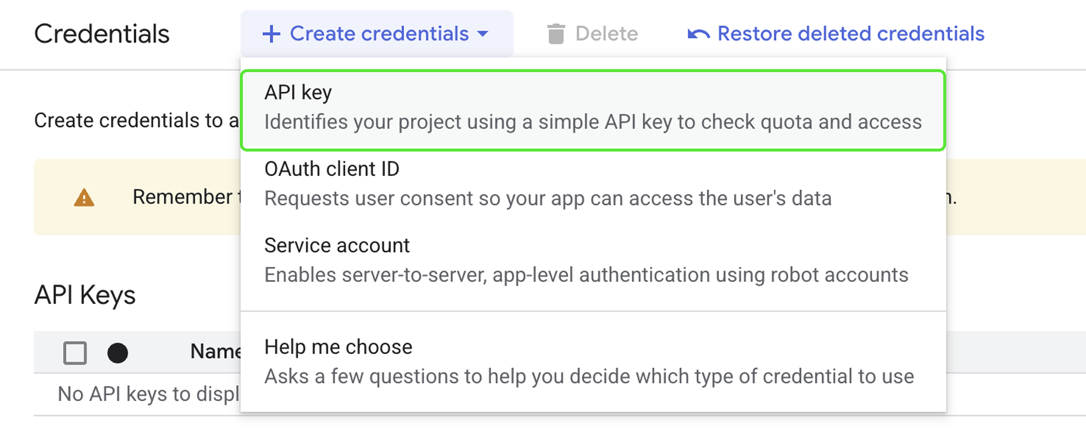 Cliquez sur + Créer des identifiants et sélectionnez Clé API.