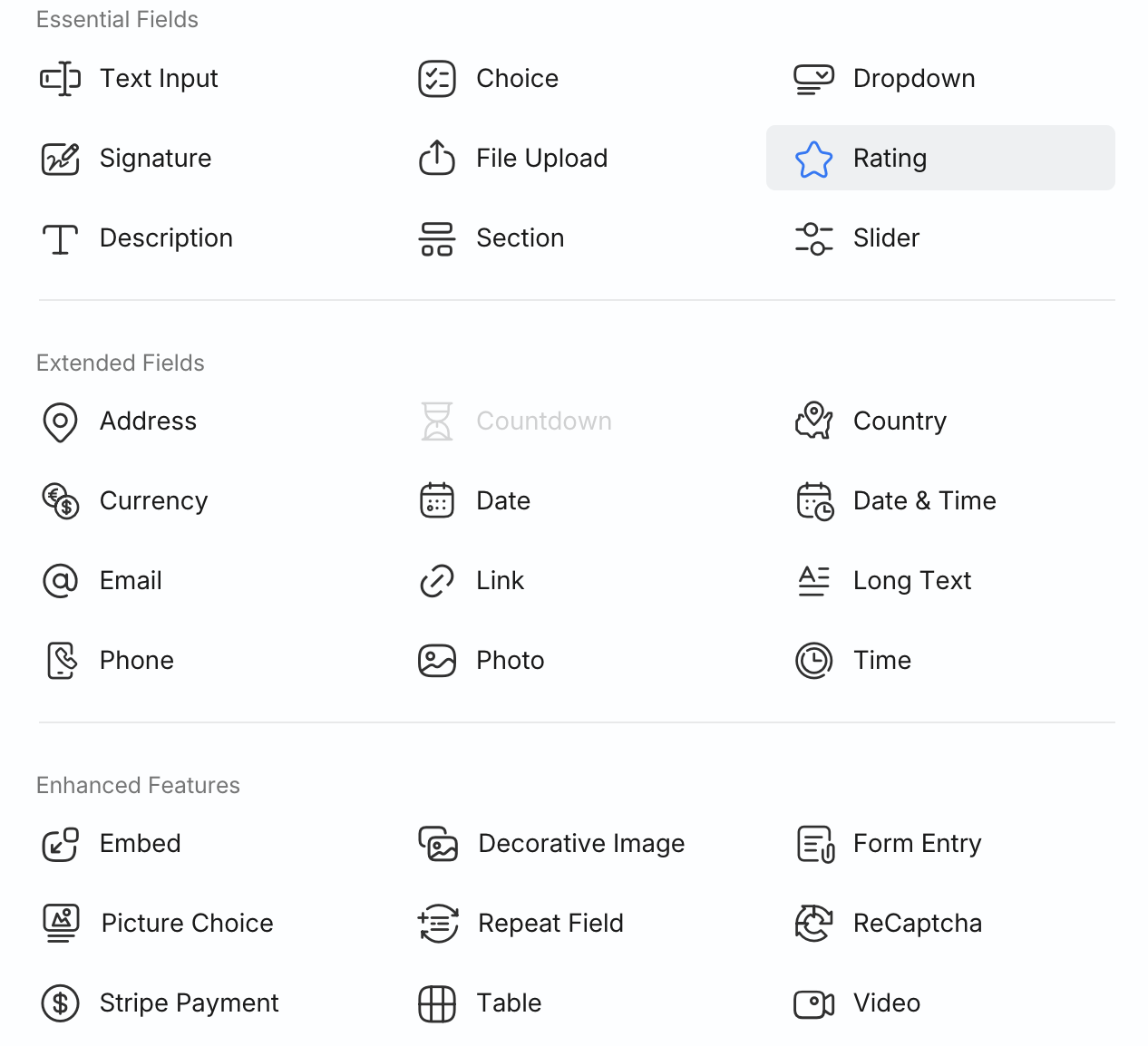 Les champs dans le créateur de formulaires sont regroupés en trois catégories selon leur objectif :