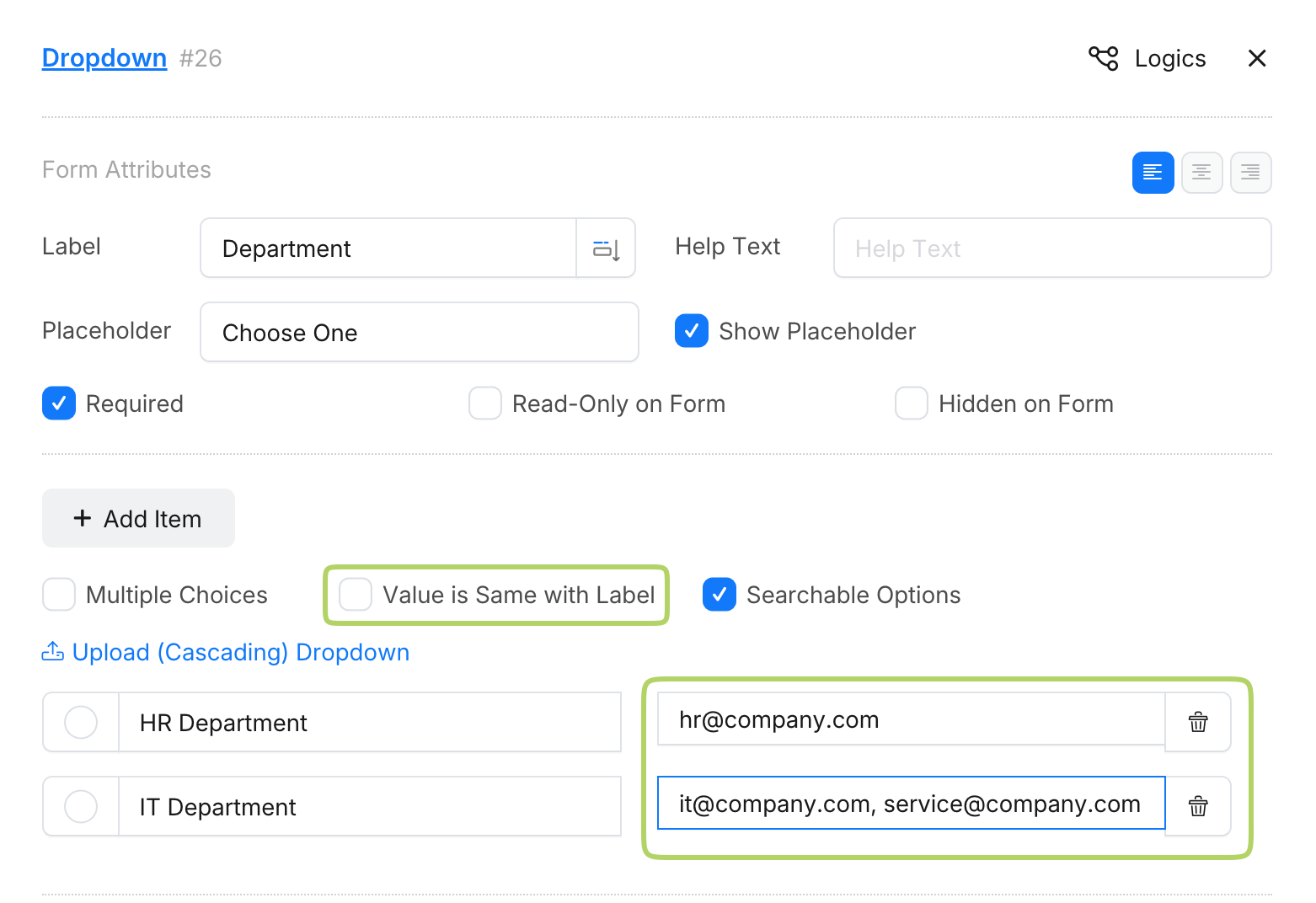 Pour le champ déroulant, ajoutez des éléments avec des adresses email. Si vous préférez ne pas exposer les adresses email à l’utilisateur final, désactivez l’option La valeur est identique à l'étiquette. Ensuite, saisissez une étiquette conviviale et définissez l’email comme valeur du champ déroulant. Notez que vous pouvez inclure plusieurs valeurs dans un élément, séparées par des virgules.