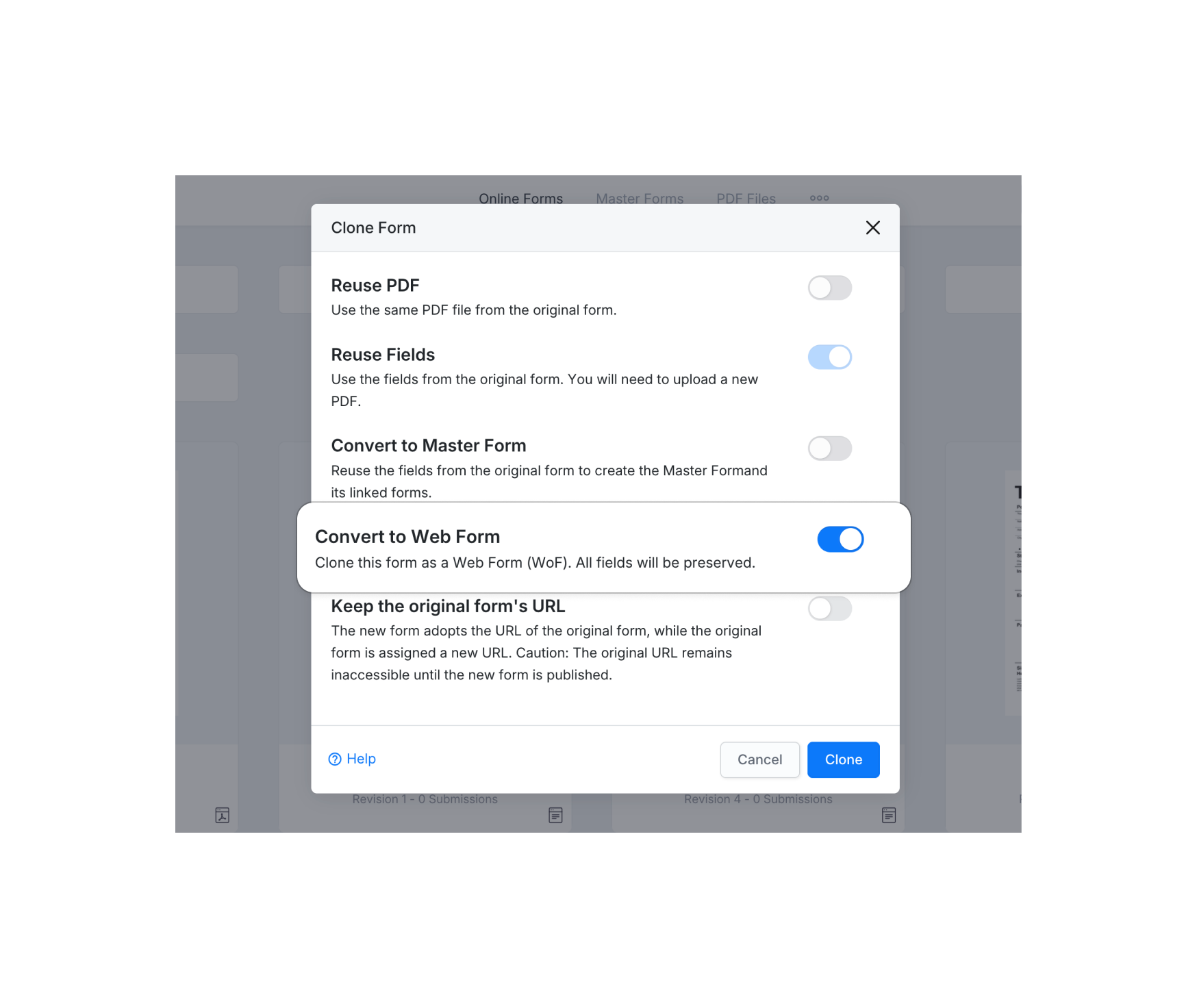 📍 Trouvez-le ici : Tableau de bord → Menu Formulaire (icône d’engrenage) → Cloner le formulaire → Basculer Convertir en formulaire Web. Pour plus de détails, consultez Cloner des formulaires.