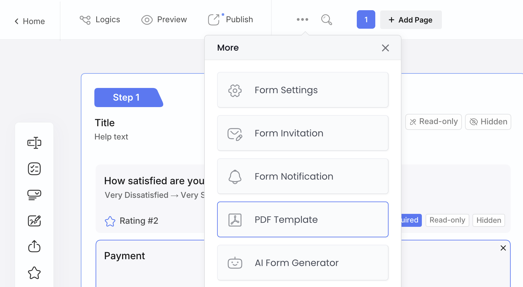 📍 Trouvez-le dans l’éditeur de formulaire → Plus (⋯) → Modèle PDF