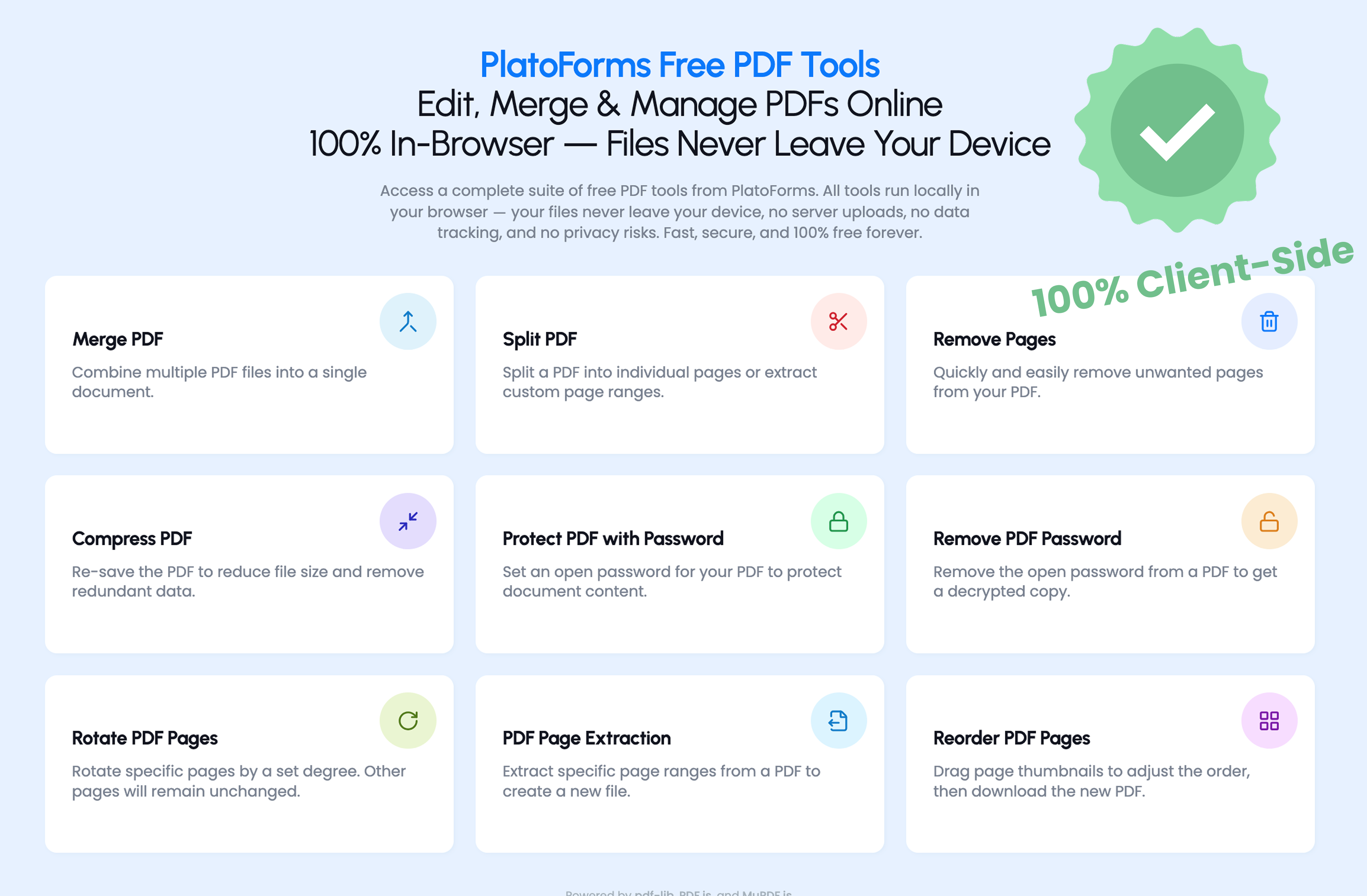 Besoin de modifier rapidement un document mais préoccupé par la confidentialité ? Notre nouveau PDF Toolbox offre une alternative hautement sécurisée aux éditeurs en ligne standards en traitant vos fichiers entièrement dans votre navigateur.