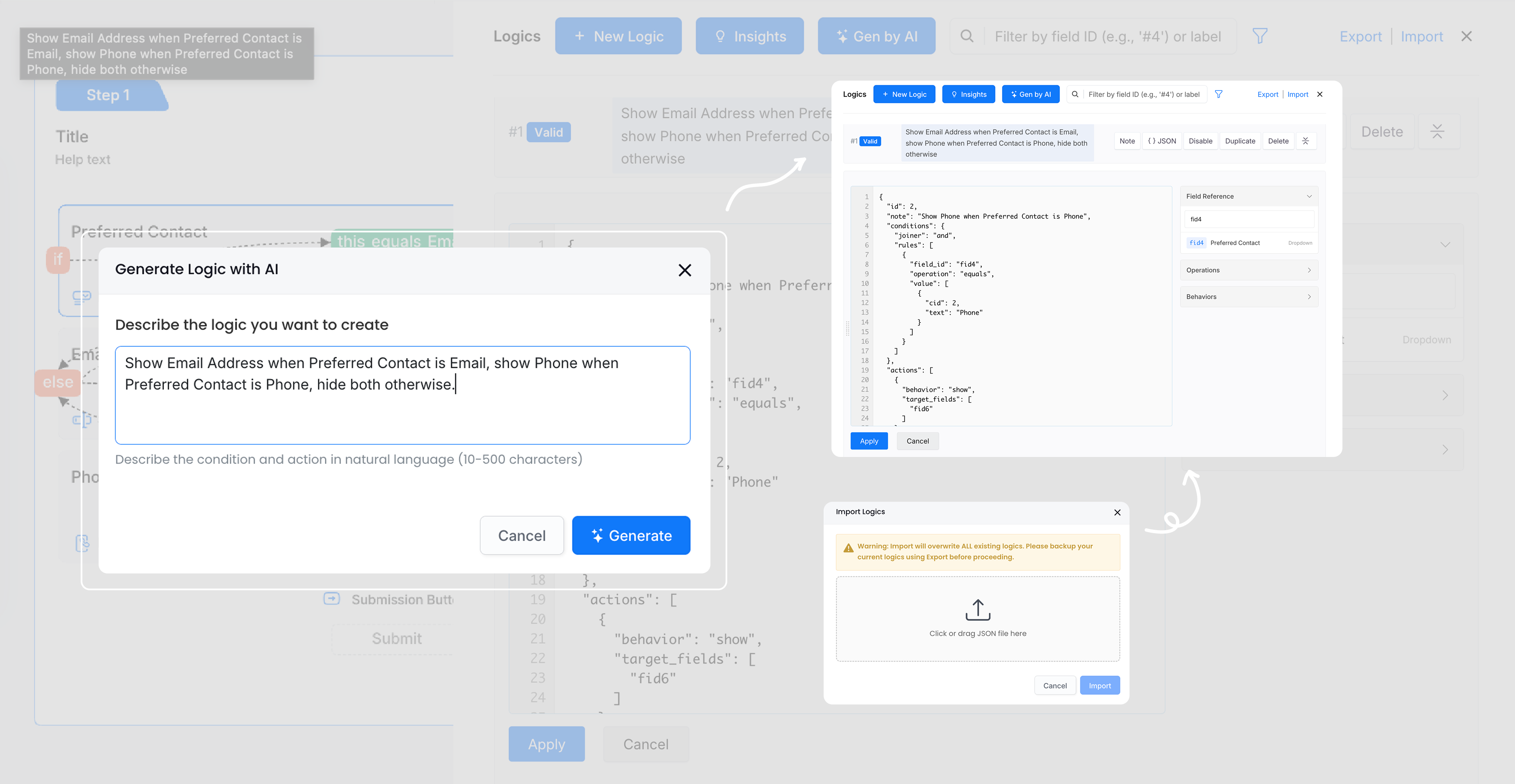 Migration de logique en masse : Gérez des règles étendues sans effort avec les nouveaux outils Exporter et Importer. Vous pouvez maintenant sauvegarder toute votre configuration logique ou la répliquer sur différents formulaires en un seul clic.