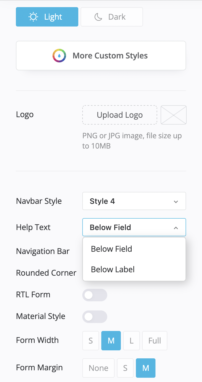 In the new design interface, take control of fonts, styles, and pre-built themes. Customize typography with Google fonts, upload background images, and add banners for personalized, visually striking forms. Don’t forget the one-click dark mode option for a sleek and modern alternative.