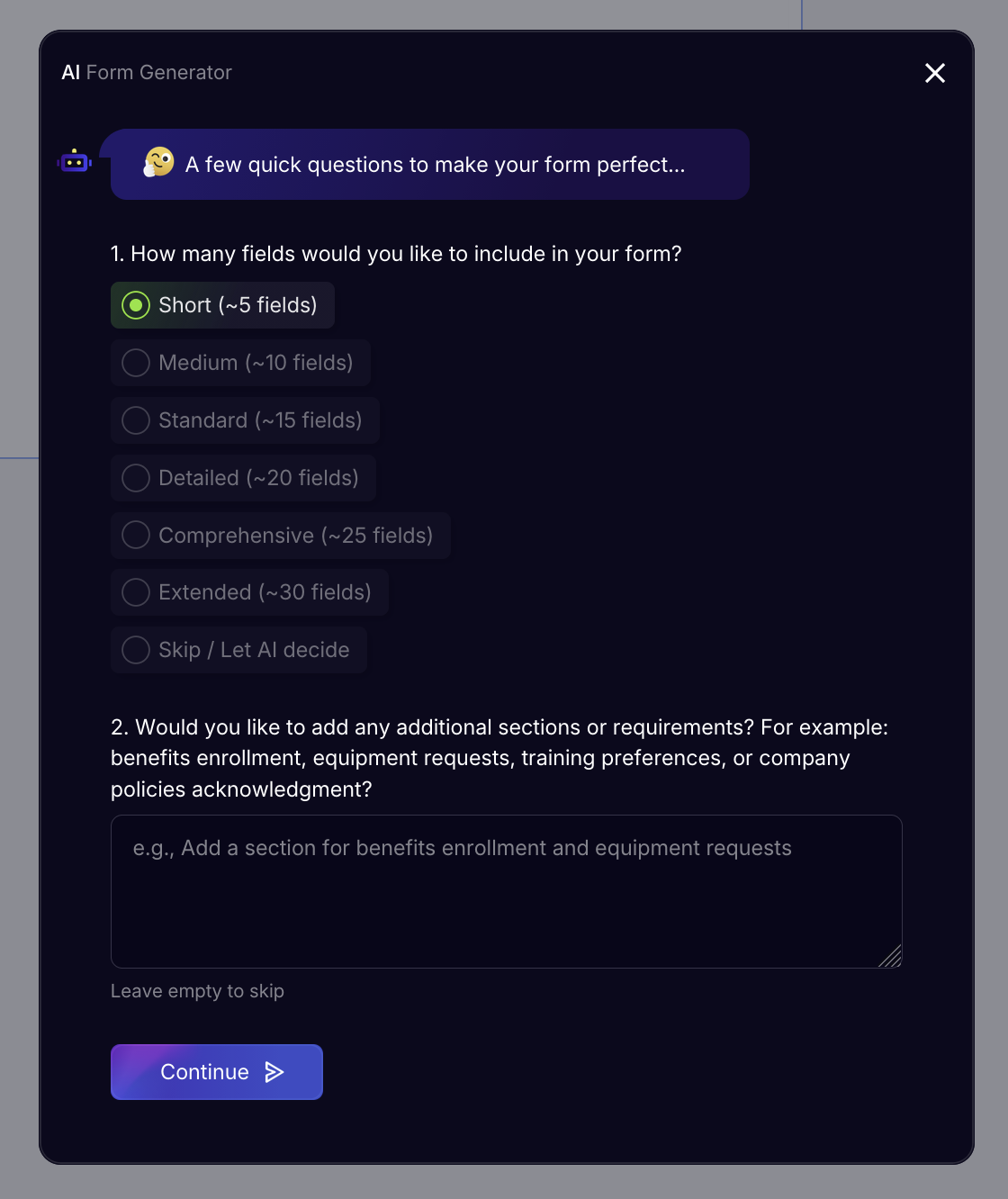 AI analyzes your description and creates relevant fields, help text, and input types in a clean, editable layout.