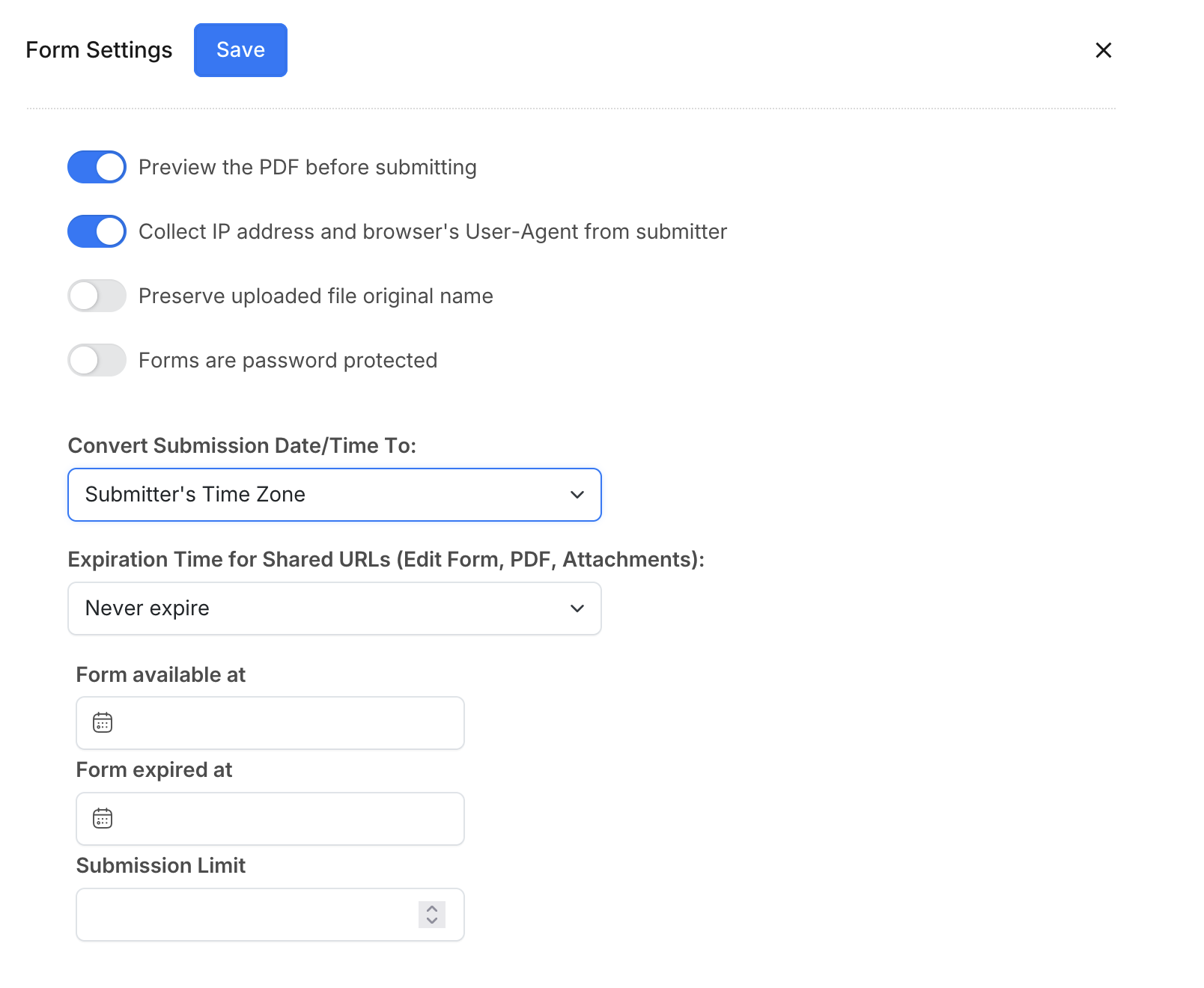 All passcode options are available under Form Settings. Use them together for end-to-end protection—from accessing a form to viewing shared submissions.