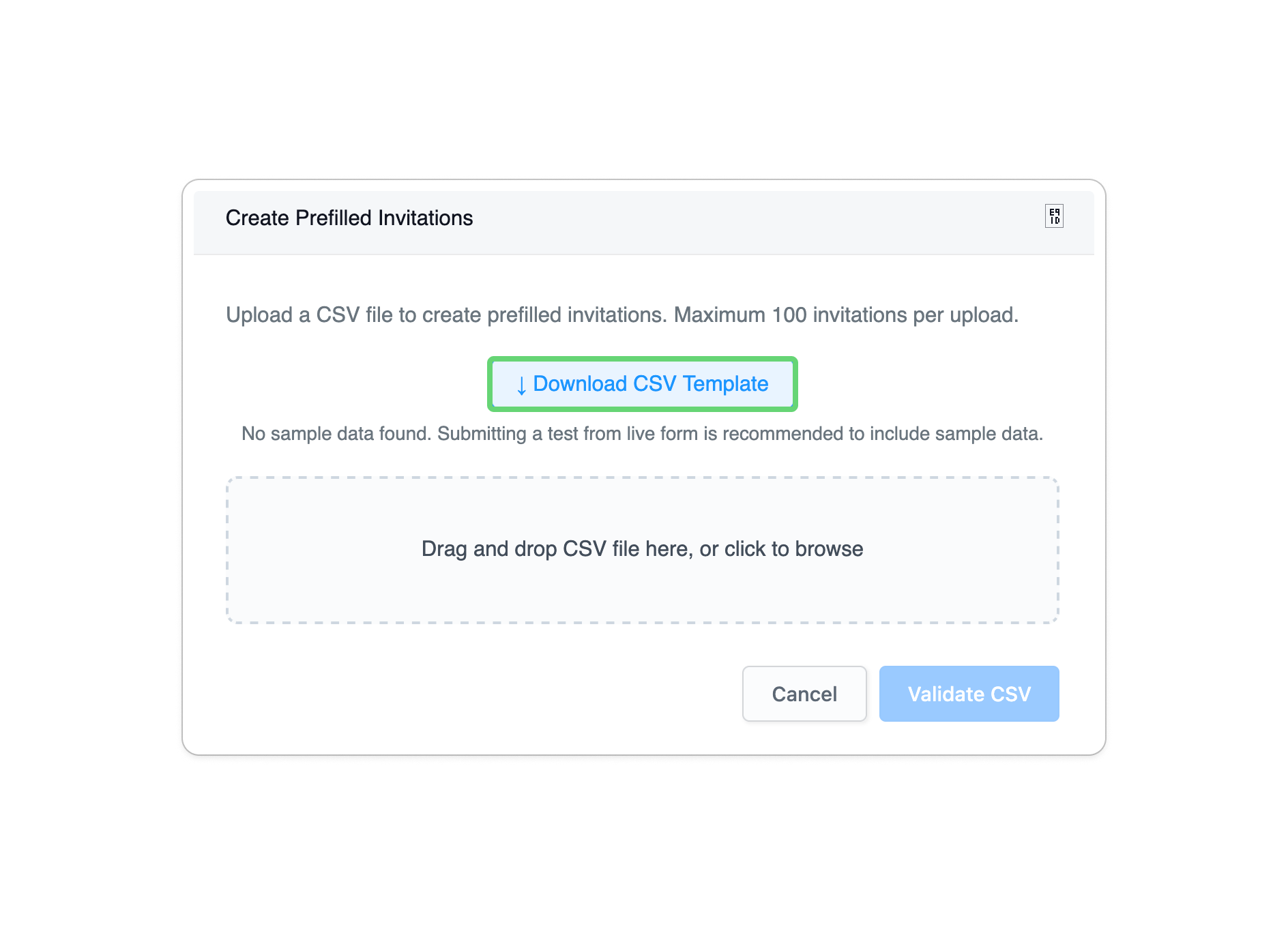 | 批量预填(CSV) | 上传 CSV 以生成带有唯一数据的大量邀请。非常适合大批量分发。 |
